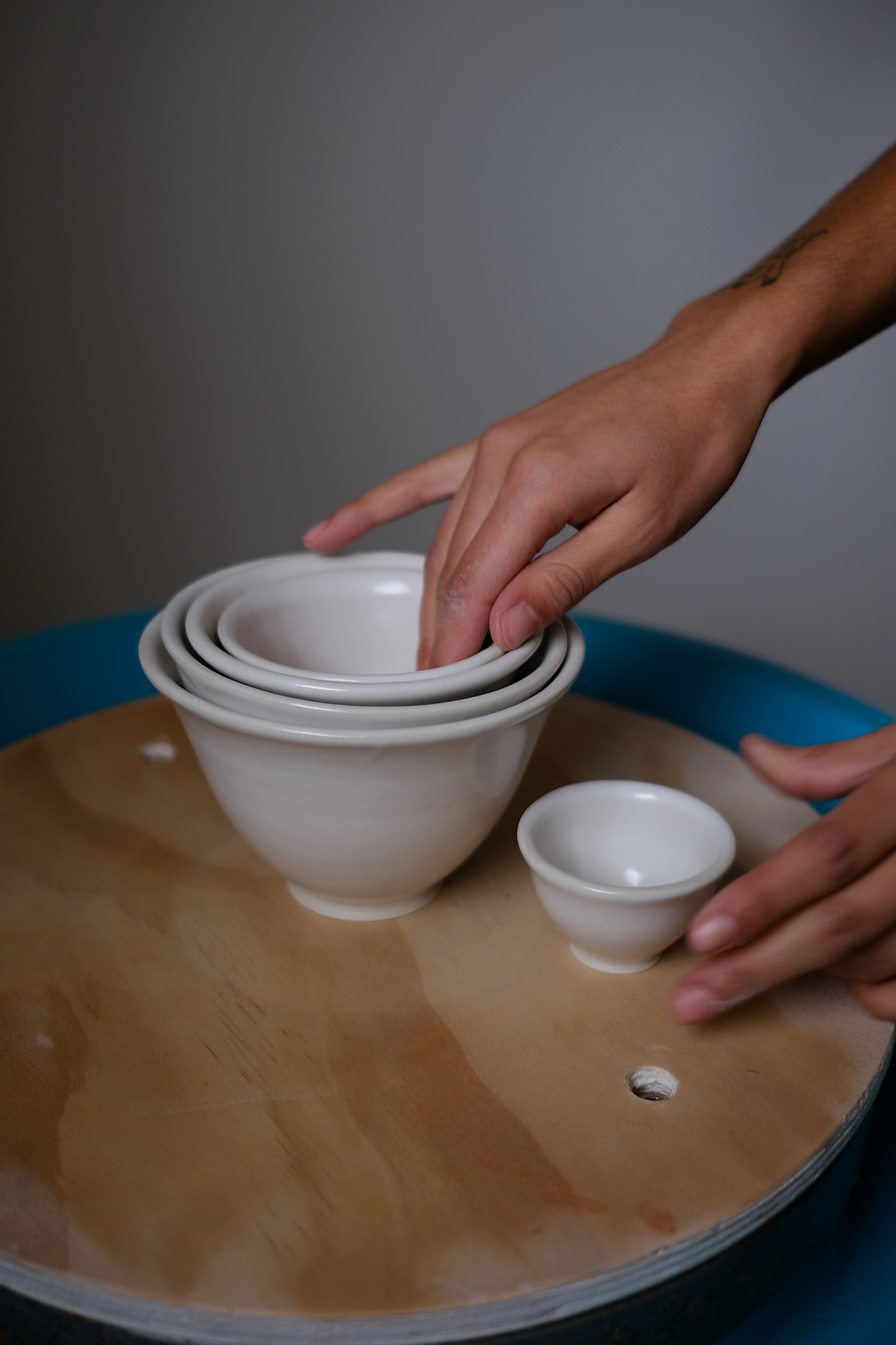 The White Aperitif pieces are hand-thrown from durable stoneware clay using traditional wheel-throwing techniques. To ensure their longevity, we suggest hand washing these ceramics. Please handle them with care, particularly the bases, which are delicate and susceptible to chipping if mishandled.