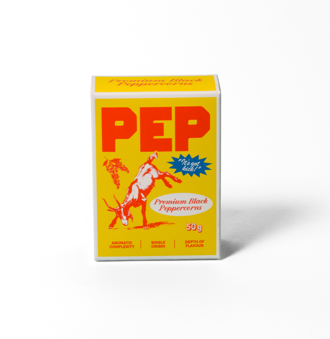 50g refill pack of vacuum-sealed whole black peppercorns, with a special pop-out pourer funnel on the back to help you get your Pep in your grinder without spillage.