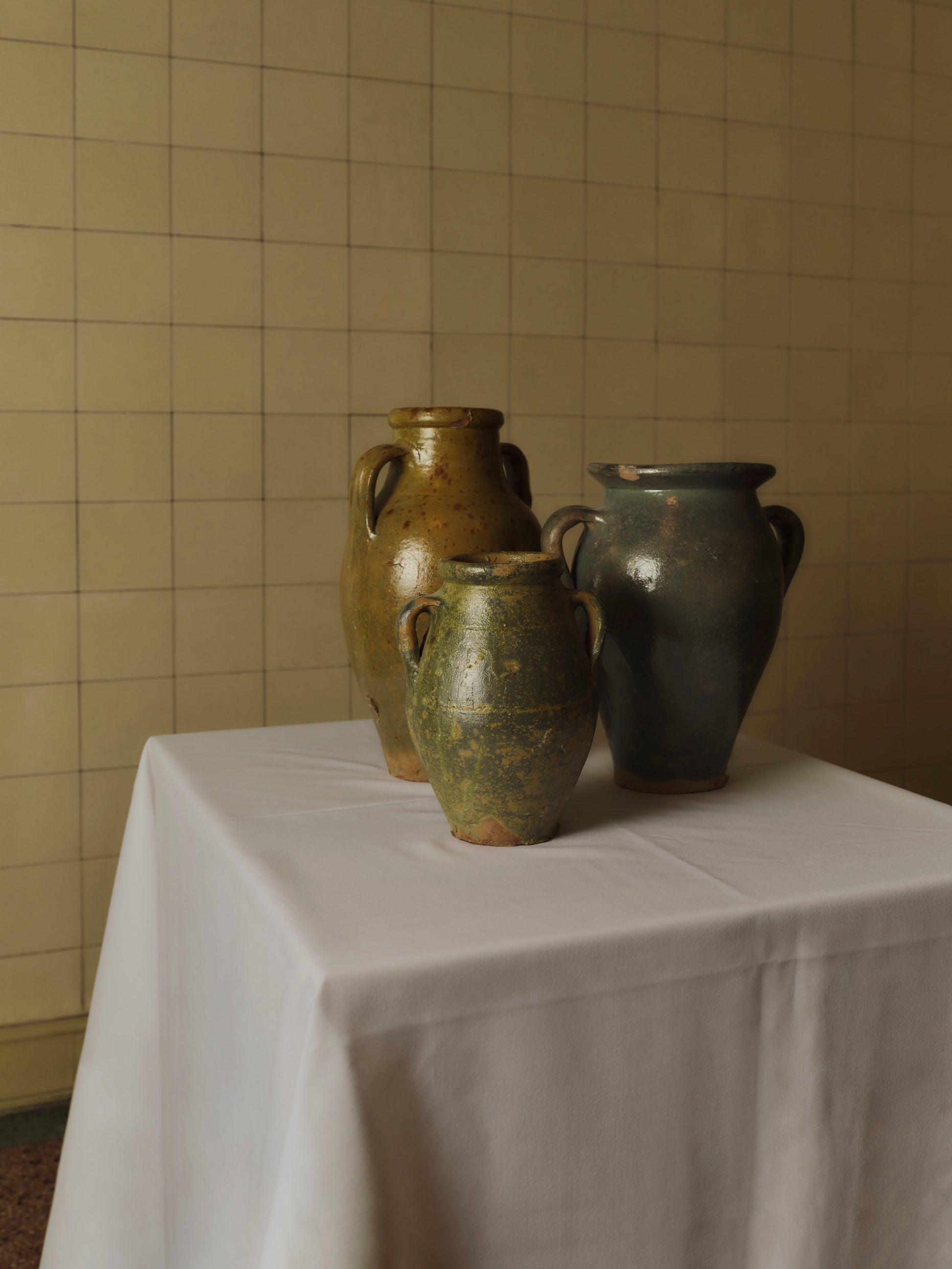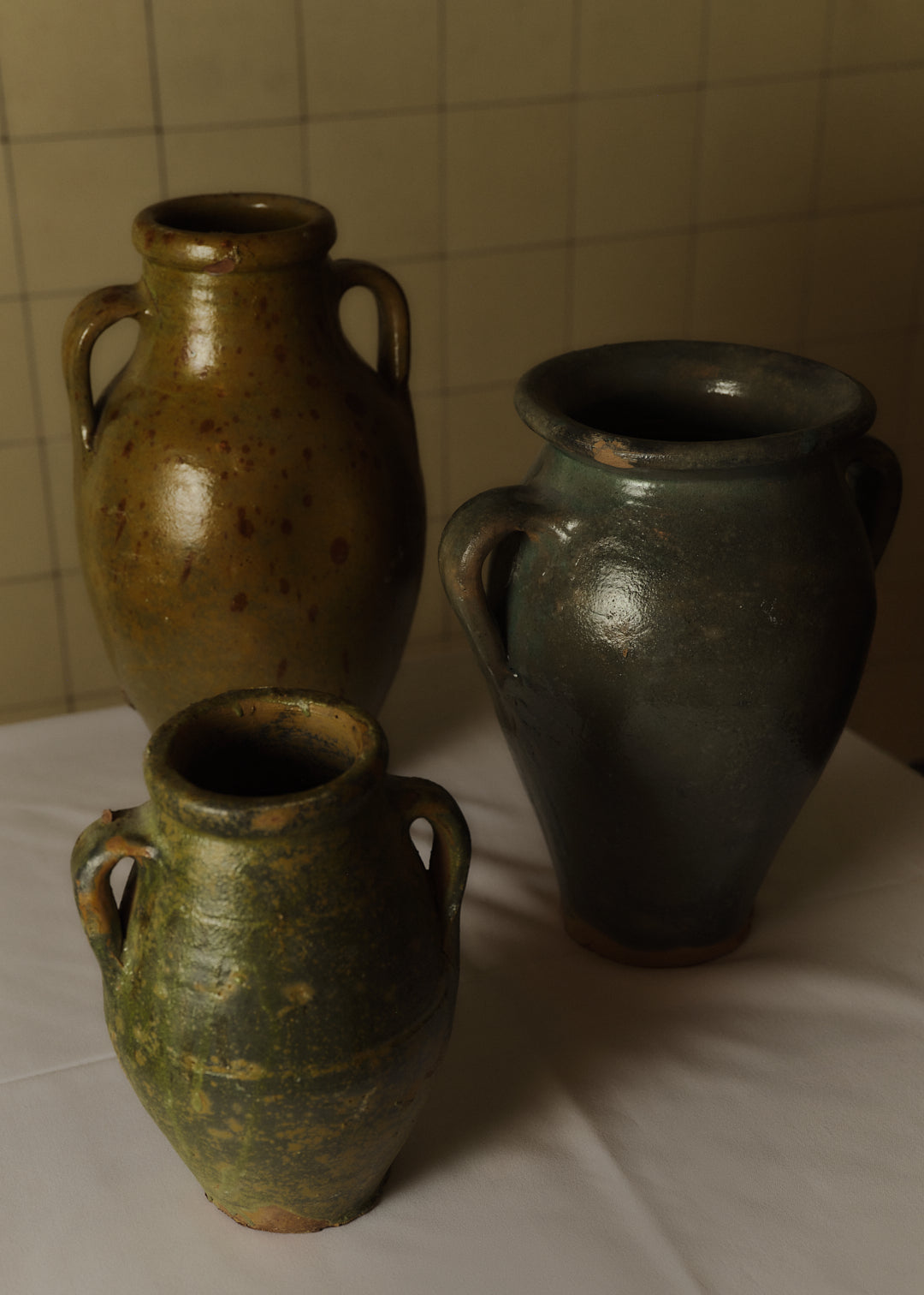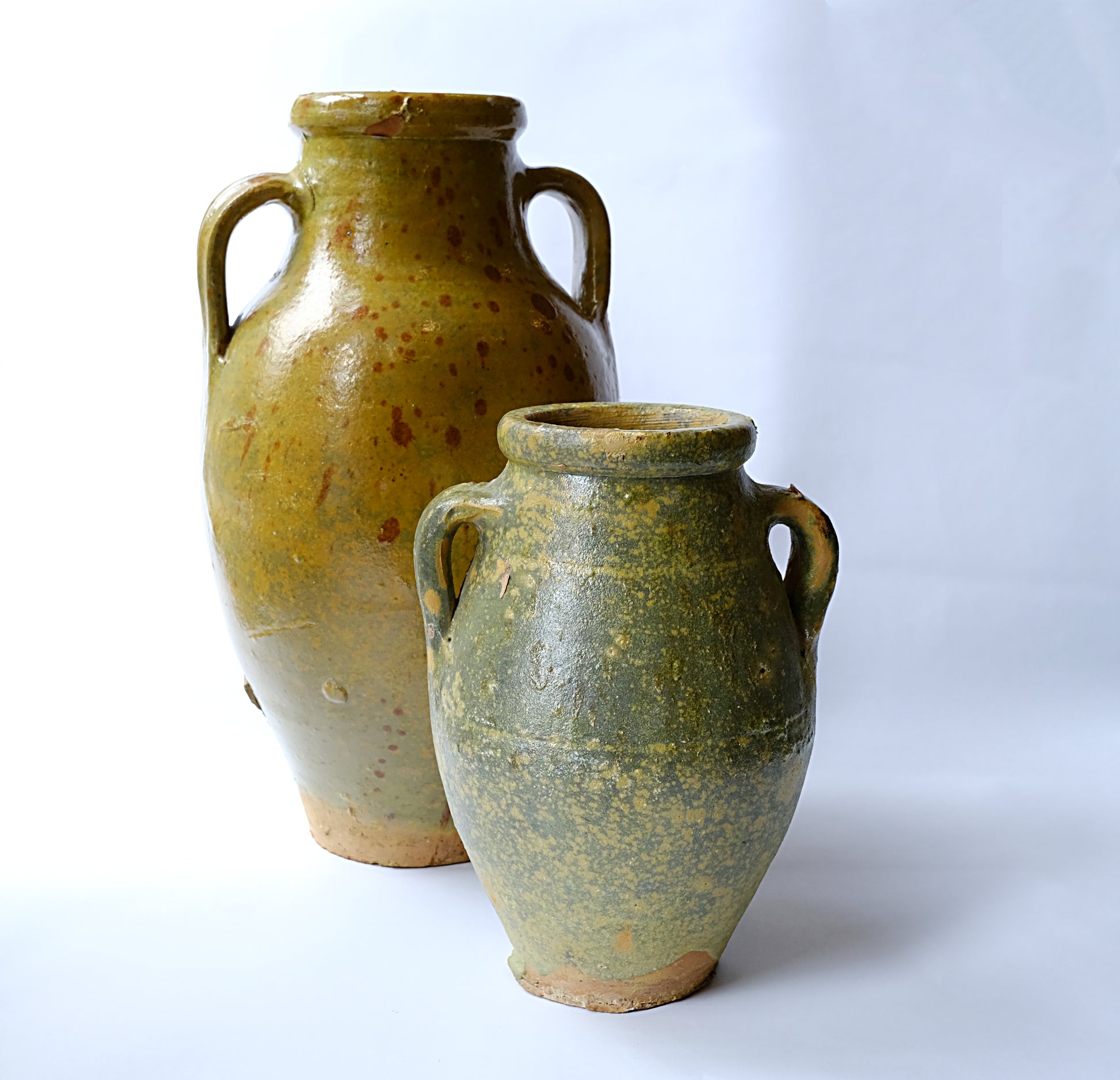 Vintage ceramic glazed pots of various sizes.
